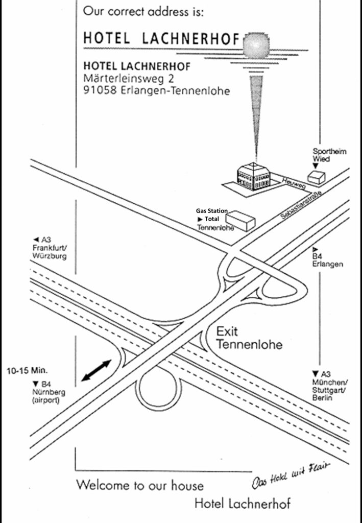 | Take Exit # 84 ‘Tennenlohe’ of Highway A3 – go direction Erlangen. After Exit ‘Tennenlohe-Gewerbegebiet’ and crossing the ‘B4’, take a right into Street ‘Sebastianstrasse’. At the end of the town take a left into Street ‘Heuweg’ – straight on and you are there! |